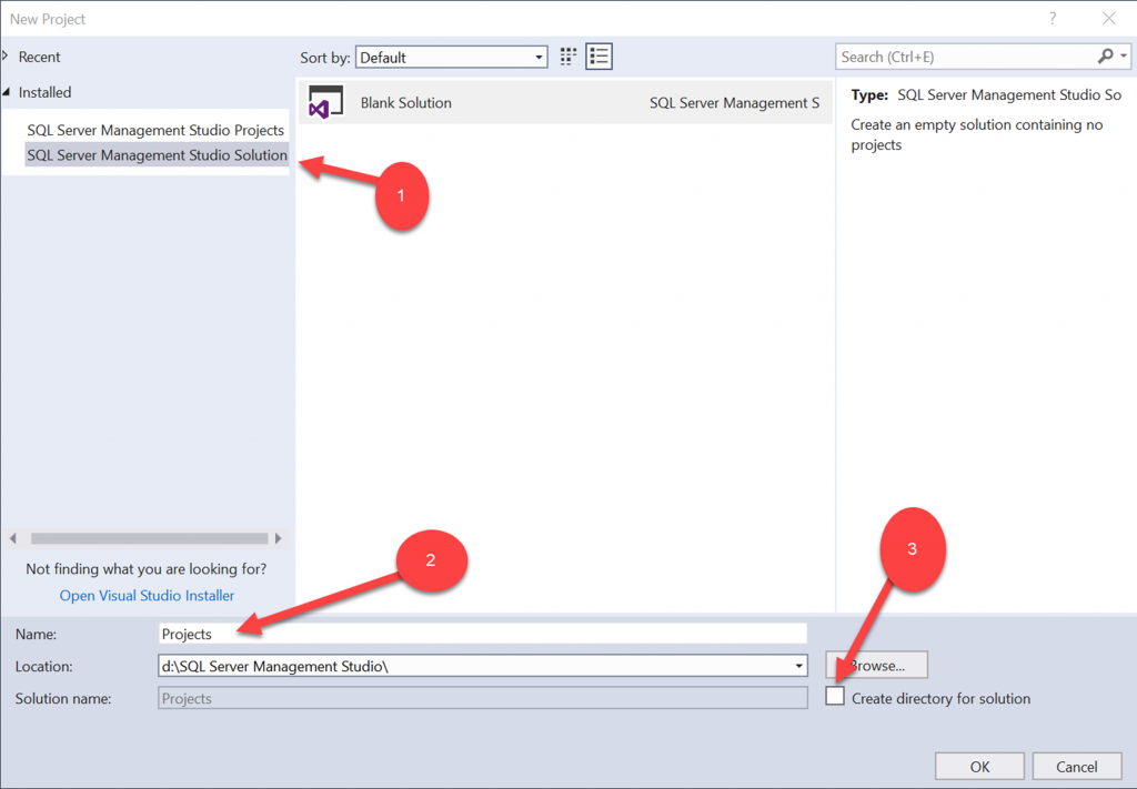 On the dialog box resist the urge to select the first option in 1. Select the second to create a solution. 2. Name the project. 3. Unselect the create directory for the solution.
