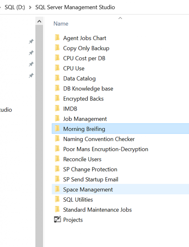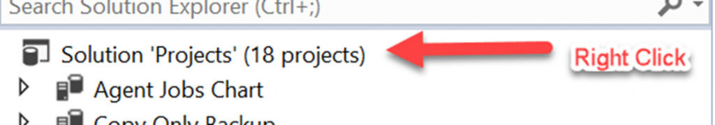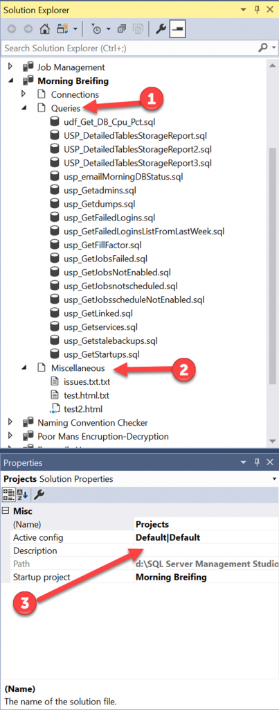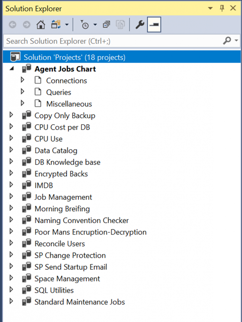 In SSMS Solution Explorer you will not see a Project title and Connections, Queries, and Miscellaneous.