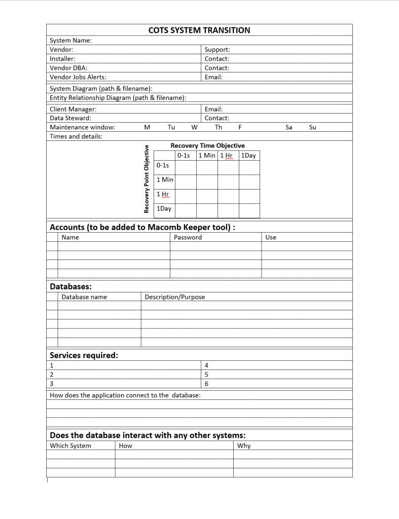 The project will take the better part of a year because I am working with COTS vendors and the support is a tad slow. This round can get updating documentation to switch the application from one database server to another. This will reduce the dependency and delays on the server replacements. In the future, we are planning on collecting this and some additional information on system transfer to production maintenance for all new systems also.