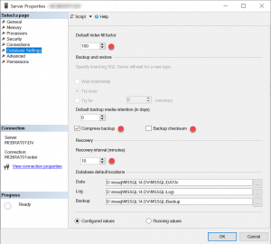 Where did I start? BACKUPS. I added SQL agent jobs. The jobs included log backups, diff backups, and full backups. The brought the maximum number of minutes of data lost was now at 1440. Later I adjust the jobs to get the maximum data lost to 100-200 minutes, depending on the system. Yes, the system was eating up a ton of storage space. The network storage guy has me back this off a bit until they could get more